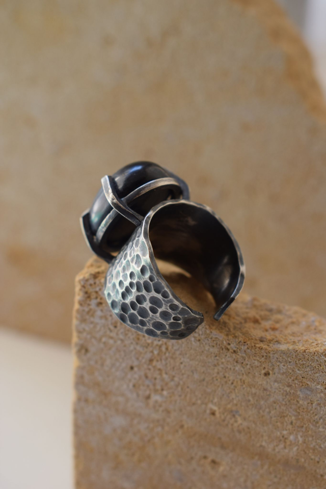 Bague contemporaine et brute, sertie d’une Pietersite chatoyante aux reflets profonds.