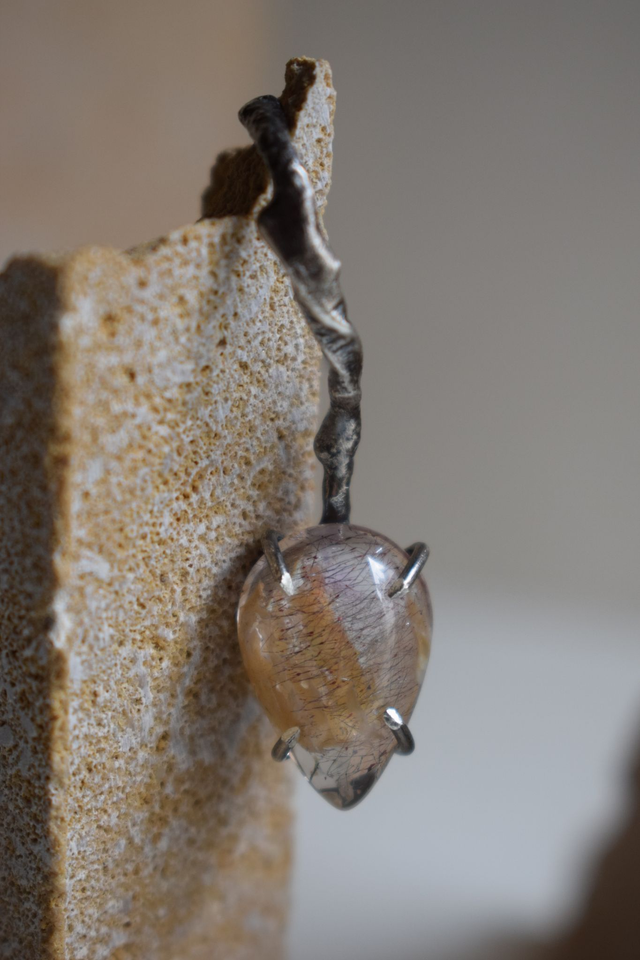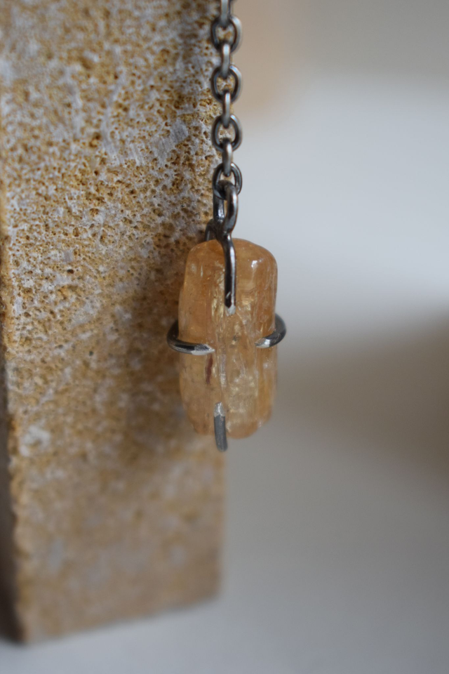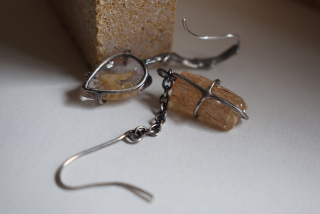 Boucles d’oreilles asymétriques, contemporaines et délicates, serties d’une Topaze Impériale roulée et d’un Quartz à inclusions de Limonite et Lepidocrosite.
