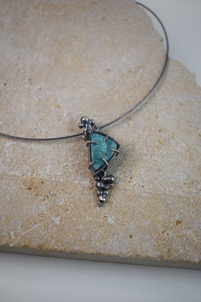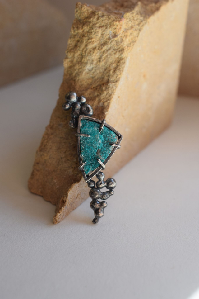 Pendentif élégant et contemporain, serti d’une petite druze de Dioptase.